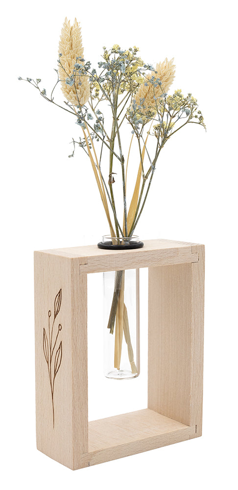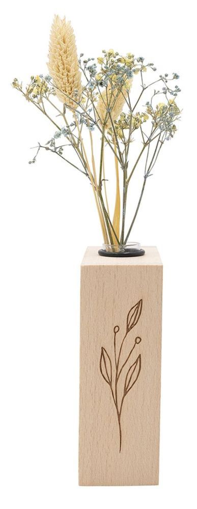 Unser hochwertiger Holzvasenhalter im rechteckigen Format bietet Platz für kleine Blumen und ist die neueste Kreation unserer Produktwelt "Wood-Art". Die wunderschön gestalteten Gravuren an den Seiten wecken gemeinsam mit dem hochwertig verarbeiteten Holz eine gemütliche Atmosphäre in jedem Wohnraum.