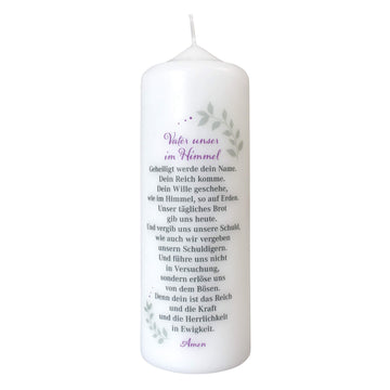 Das "Vaterunser", grafisch umgesetzt mit filigraner Schrift und feinem Muster auf weißer Kerze, einzeln verpackt in Cellophan.