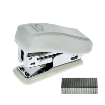 Handlicher Mini-Tacker aus weißem Kunststoff, inkl. Klammern (Nr. 26/6).
