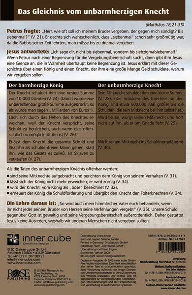 Vergebung ist gleichermaßen ein Schlüssel zum Sieg über die Sünde, zur inneren Heilung und zur Wiederherstellung von Beziehungen. Allerdings ist es oftmals ziemlich schwer[kein Komma] zu vergeben. Die Studienfaltkarte zeigt eindrücklich auf, wie verletzend und zerstörerisch Sünde ist - und welch große Bedeutung folglich Vergebung auf der anderen Seite hat. Gott selbst will vergeben ? und er vergibt uns auch zuerst, durch Jesus Christus ? indem wir ihm glauben und vertrauen. Dies verdeutlicht die Studienfaltkarte anhand mehrerer Bibelpassagen zum Thema.