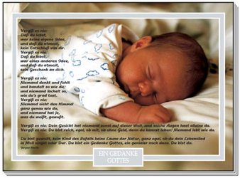 Vergiss es nie: Dass du lebst, war keine eigene Idee, und dass du atmest, kein Entschluss von dir. Vergiss es nie: Dass du lebst, war eines anderen Idee, und dass du atmest, sein Geschenk an dich. Vergiss es nie: Niemand denkt und fühlt und handelt so wie du, und niemand lächelt so, wie dus grad tust. Vergiss es nie: Niemand sieht den Himmel ganz genau wie du, und niemand hat je, was du weißt, gewusst. Vergiss es nie: Dein Gesicht hat niemand sonst auf dieser Welt, und solche Augen hast alleine du. Vergiss es nie: Du bist reich, egal, ob mit, ob ohne Geld, denn du kannst leben! Niemand lebt wie du. Du bist gewollt, kein Kind des Zufalls, keine Laune der Natur, ganz egal, ob du dein Lebenslied in Moll singst oder Dur. Du bist ein Gedanke Gottes, ein genialer noch dazu. Du bist du. Jürgen Werth