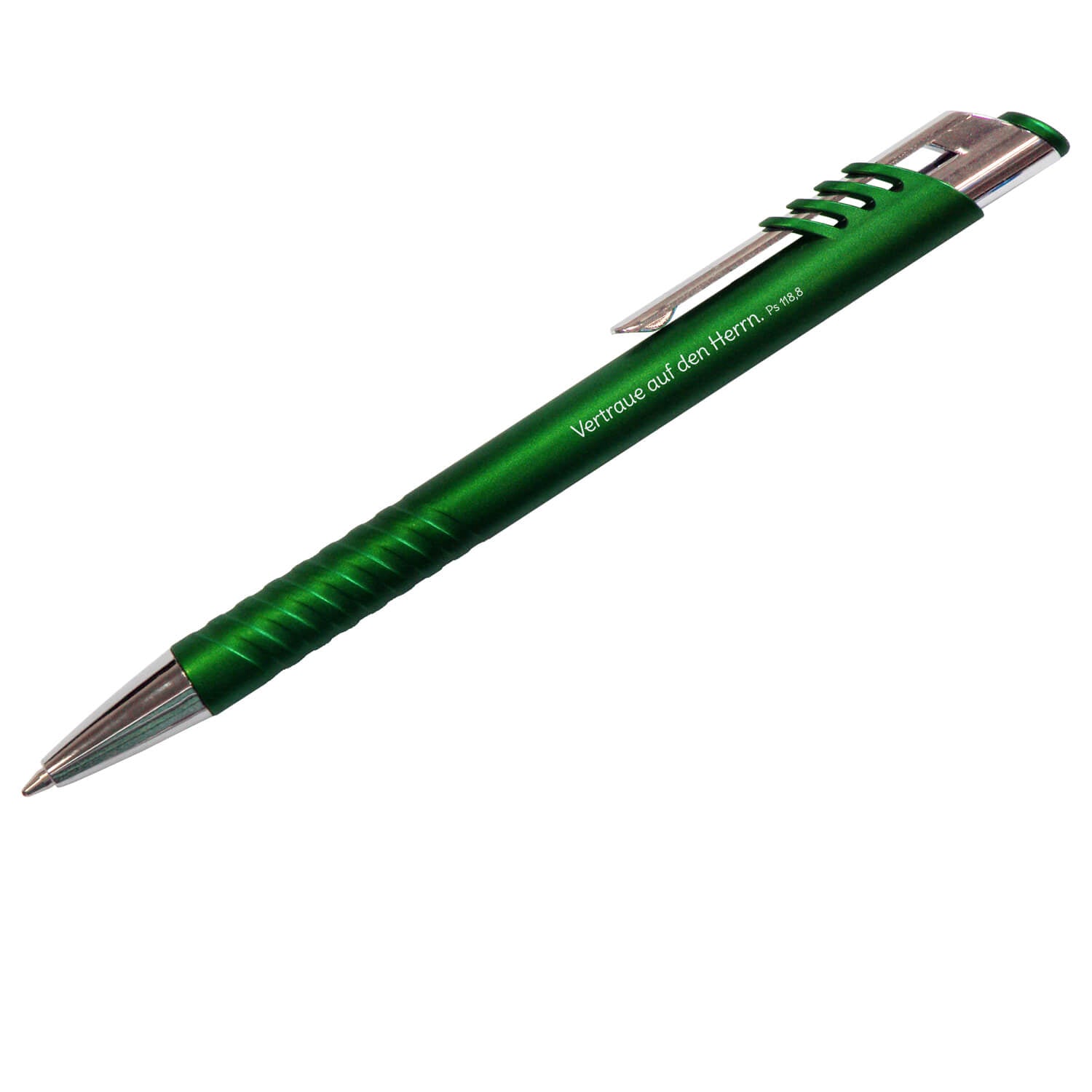 Kugelschreiber aus metallic-grünem Kunststoff, mit Textaufdruck "Vertraue auf den Herrn"