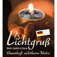 Ein kleiner Lichtgruß mit einer passenden Faltkarte (Format 9 x 9 cm). Das Teelicht ist auf besondere Weise veredelt. Beim Abbrennen schwimmt die Botschaft auf dem flüssigen Wachs und bleibt so - bis auf ein kleines Loch um die Flamme herum - sichtbar.