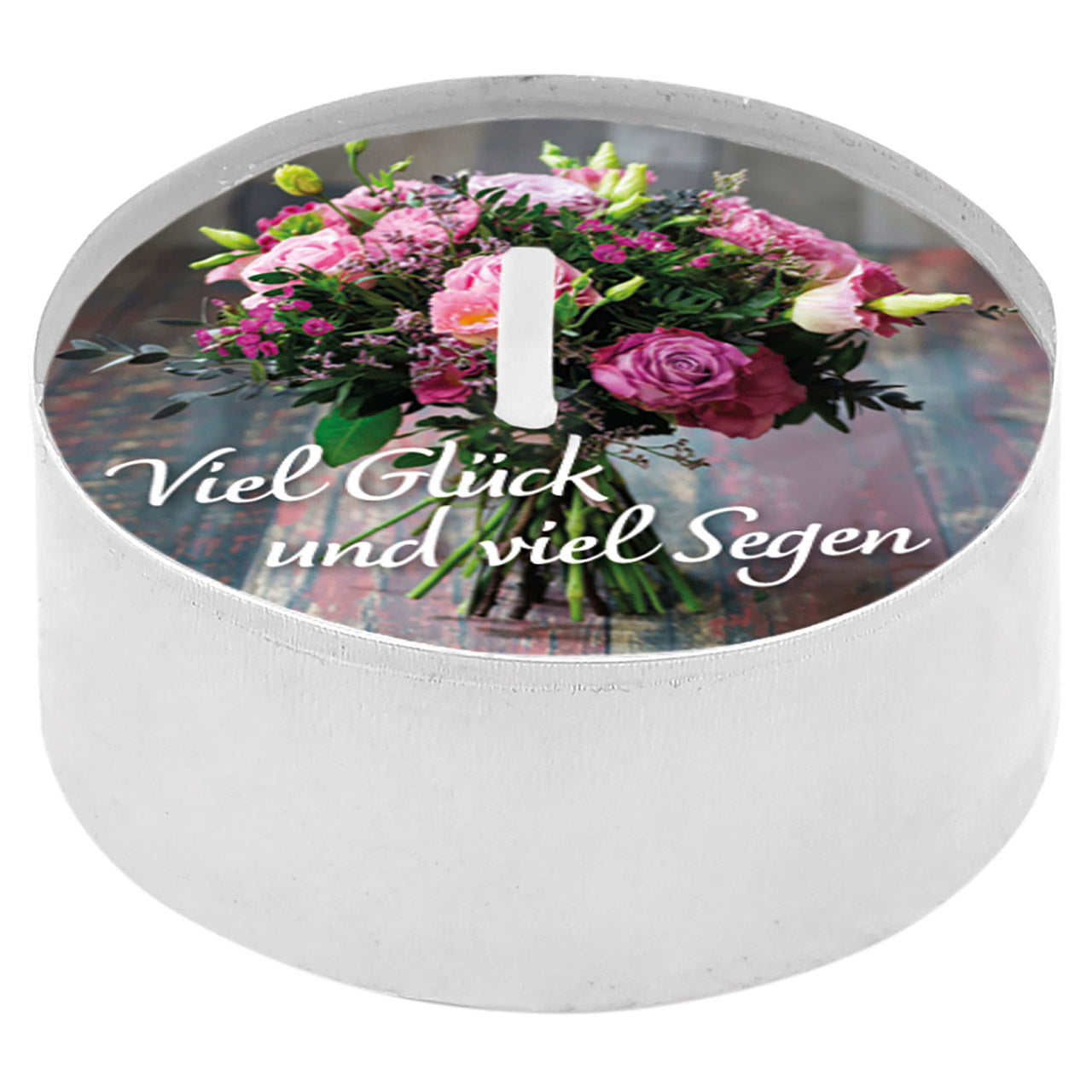 Text auf dem Teelicht: Viel Glück und viel Segen
