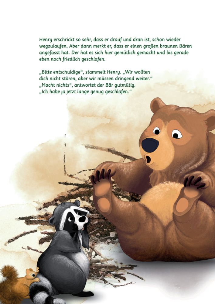 Der kleine Waschbär Henry will das Eichhörnchenbaby Ben zurück zu seinen Eltern bringen. Doch an der ehemaligen Eichhörnchensiedlung bietet sich ihm ein trostloses Bild: Der Wald wurde hier gerodet. Die Eichhörnchen sind an eine andere Stelle gezogen. Fest entschlossen, Bens Familie zu finden, macht sich der kleine Waschbär mit dem Eichhörnchenbaby auf eine abenteuerliche Suche. Der dunkle Wald ist beängstigend, doch Henry gibt nicht auf. Schließlich naht Hilfe von unerwarteter Seite. Am Ende entdeckt Henry eine Überraschung, mit der niemand gerechnet hat.