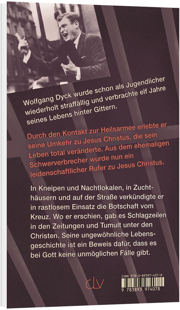 Wolfgang Dyck wurde schon als Jugendlicher wiederholt straffällig und verbrachte 11 Jahre seines Lebens hinter Gefängnismauern. Durch den Kontakt zur Heilsarmee erlebte er seine Umkehr zu Jesus Christus, die sein Leben total veränderte. Aus dem ehemaligen Schwerverbrecher wurde nun ein leidenschaftlicher Rufer zu Jesus Christus. In Kneipen und Nachtlokalen, in Zuchthäusern und auf der Straße verkündigte er in rastlosem Einsatz die Botschaft vom Kreuz. Wo er erschien, gab es Schlagzeilen in den Zeitungen und Tumult unter den Christen. Seine ungewöhnliche Lebensgeschichte ist ein Beweis dafür, dass es bei Gott keine unmöglichen Fälle gibt.