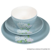 Mal ganz klassisch: Tasse und Untertasse mit zarten Hortensienblüten auf taubenblauem Hintergrund.