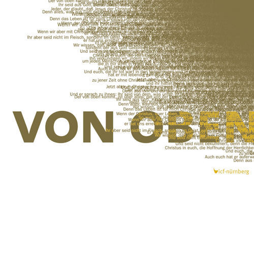 Vorwiegend deutsch und voller Wahrheit ist die neue CD der icf-nürnberg Band. Den treffenden Namen Von oben trägt sie, weil die Musik von der Offenbarung erzählt, die auch das ganze icf-nürnberg selbst durchdringt. Das neue Testament ist voll von Dingen, über die wir uns freuen können. Also, warum nicht davon singen?