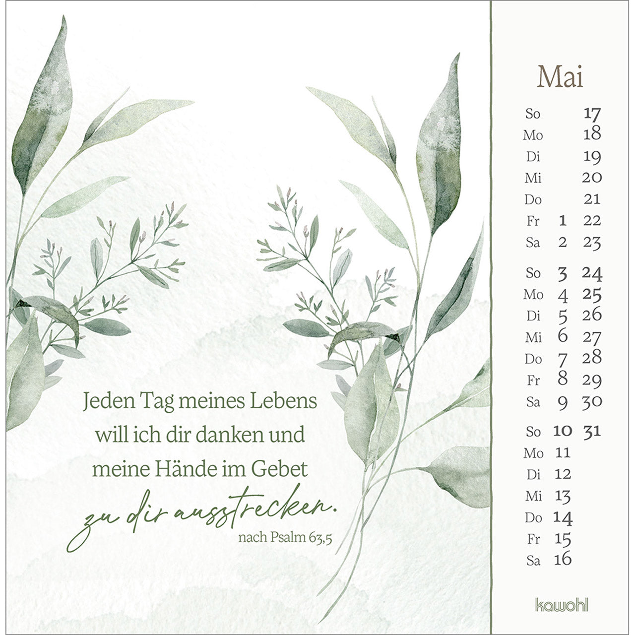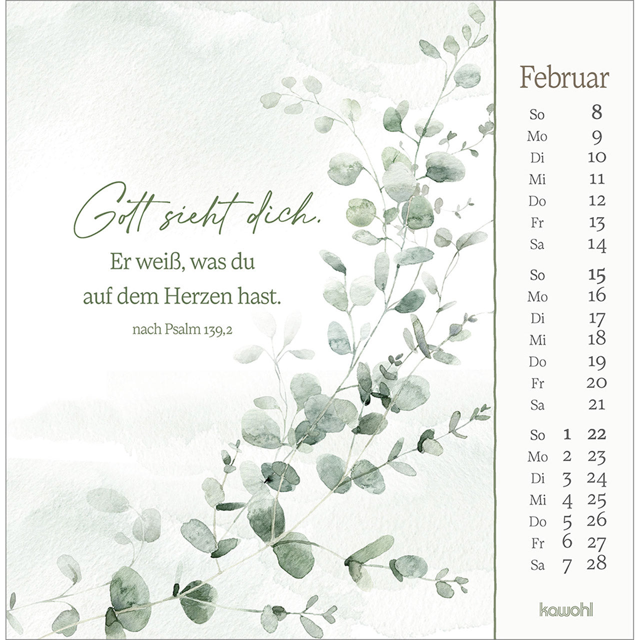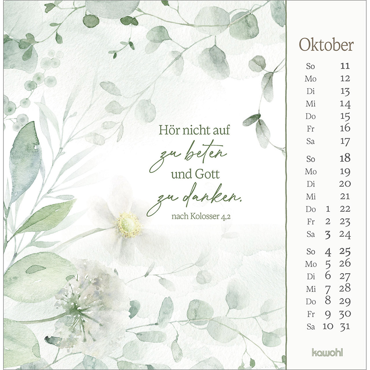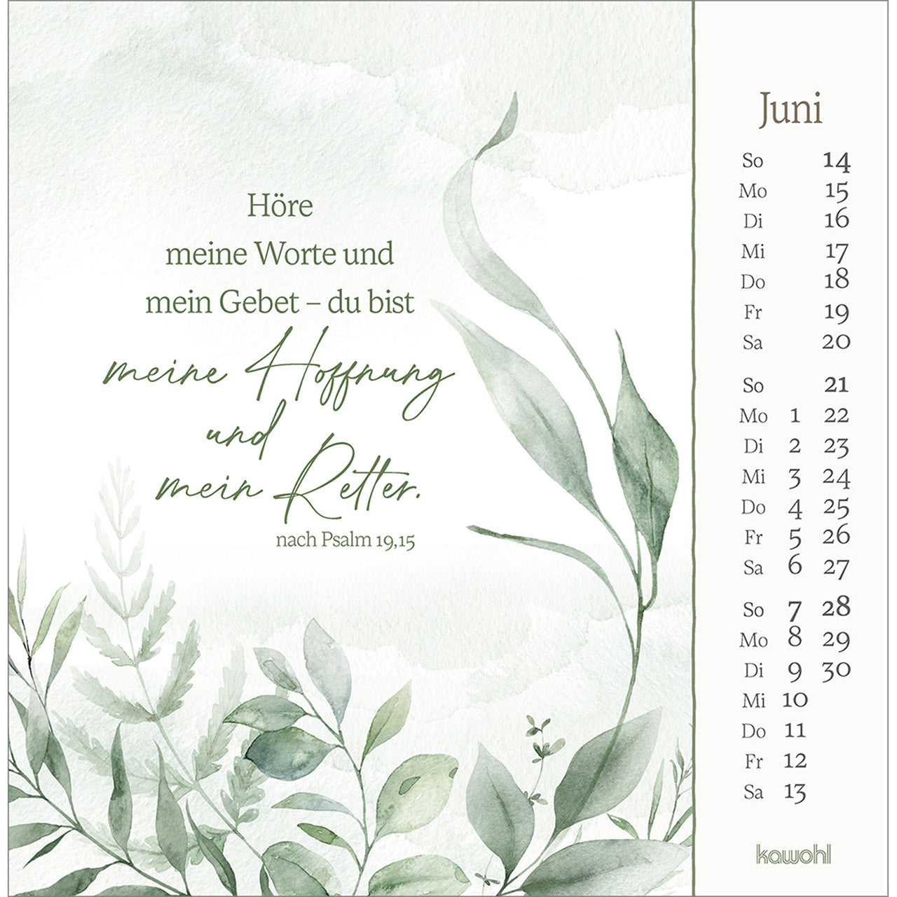 Ein liebevoll gestalteter Kalender für das geistliche Leben: Mit naturnahen Aquarellmotiven in beruhigenden Grüntönen lädt er ein, ganz bewusst im Gebet vor Gott zu kommen.