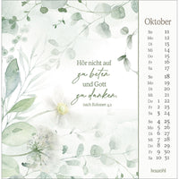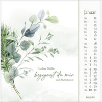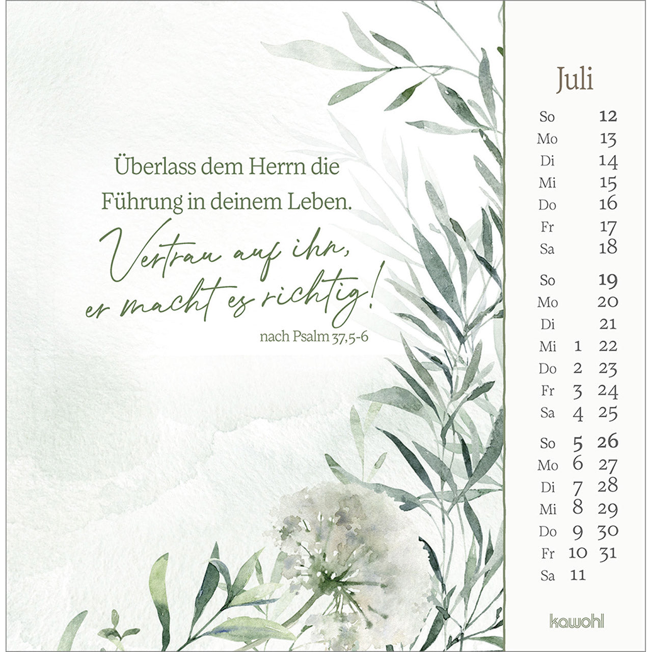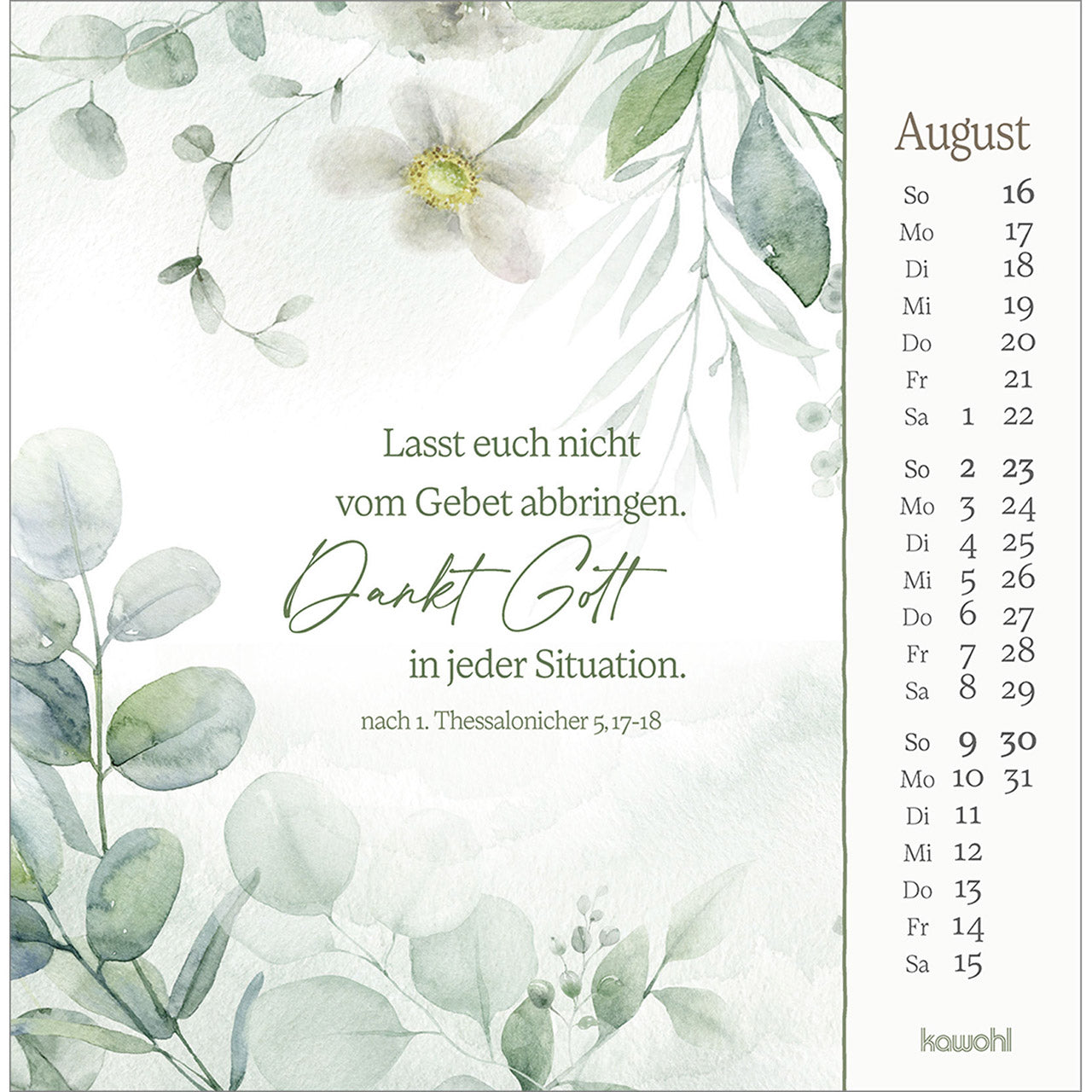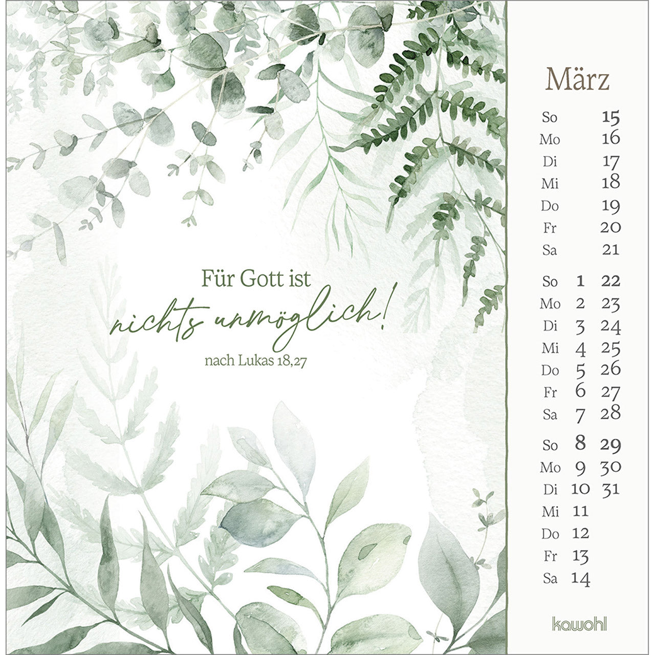 Ein liebevoll gestalteter Kalender für das geistliche Leben: Mit naturnahen Aquarellmotiven in beruhigenden Grüntönen lädt er ein, ganz bewusst im Gebet vor Gott zu kommen.