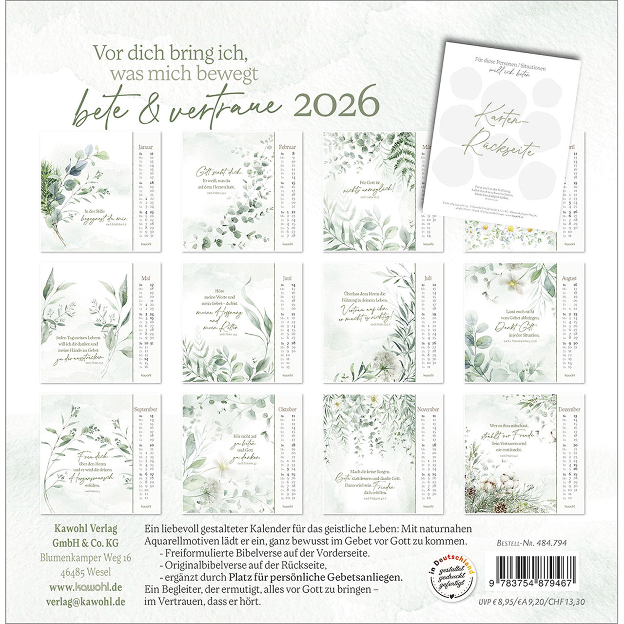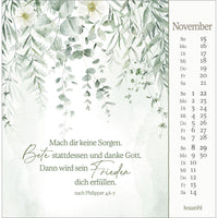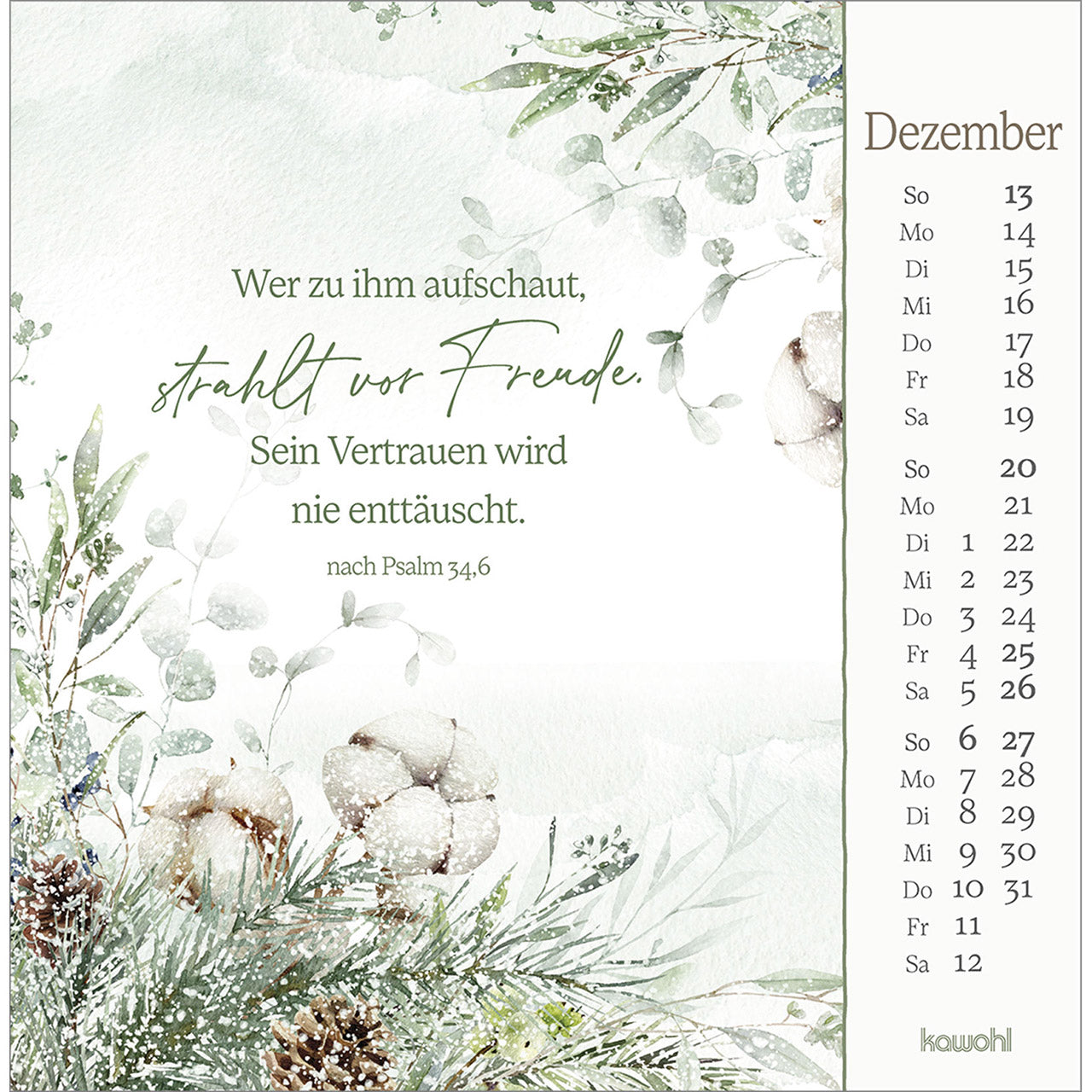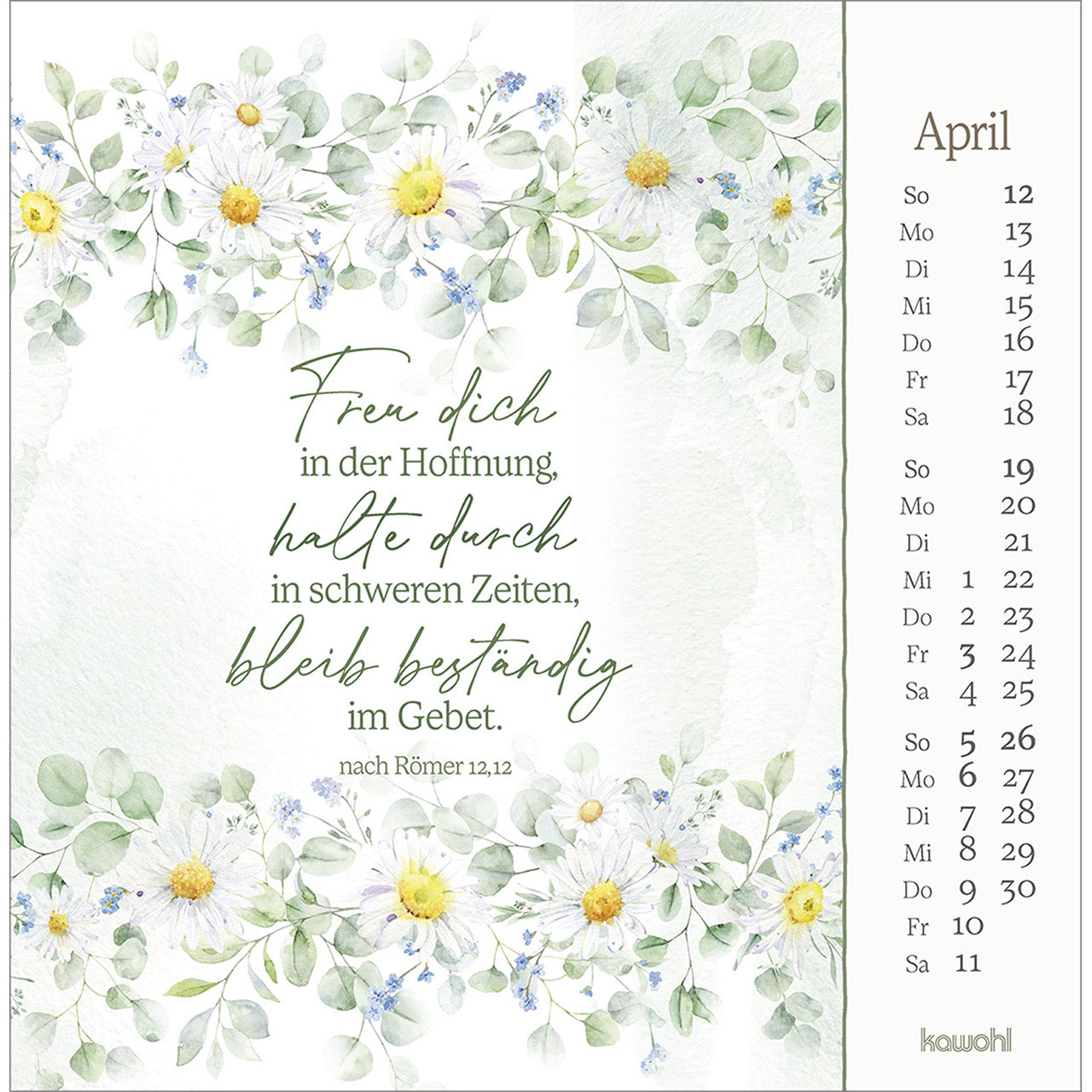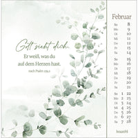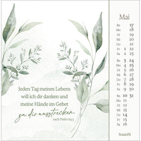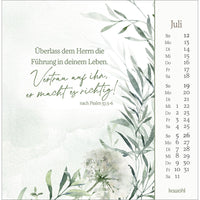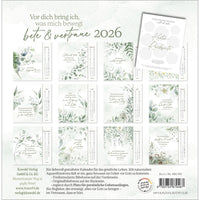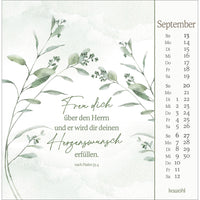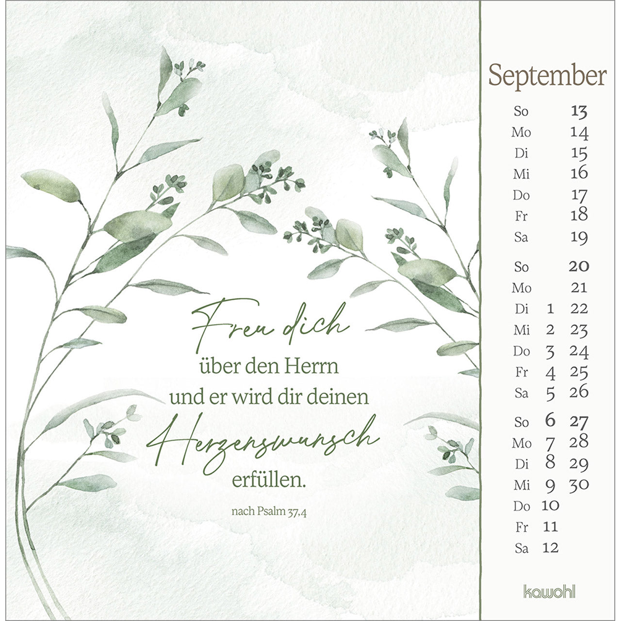 Ein liebevoll gestalteter Kalender für das geistliche Leben: Mit naturnahen Aquarellmotiven in beruhigenden Grüntönen lädt er ein, ganz bewusst im Gebet vor Gott zu kommen.
