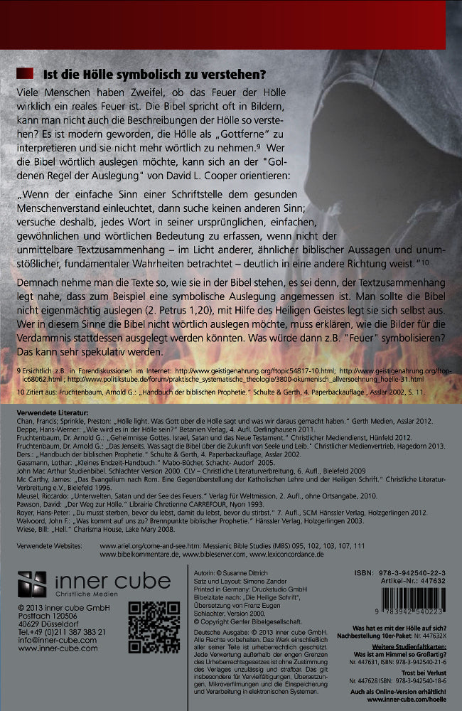 Dabei lehrt die Bibel klar und durchgängig, dass es die Hölle gibt. Auch Jesus selbst spricht mehrfach davon. Zwar bleiben dabei durchaus zahlreiche Punkte offen doch einige grundlegende Hinweise zur Hölle gibt uns die Bibel eben doch. Die Studienfaltkarte fasst diese Hinweise in leicht verständlicher Weise zusammen, geht auf verbreitete, aber falsche Vorstellungen über die Hölle ein, ordnet das Thema in den biblischen Gesamtzusammenhang ein und zeigt, dass vor diesem düsteren Hintergrund die gute, befreiende Botschaft des Evangeliums umso heller und wärmer strahlt.