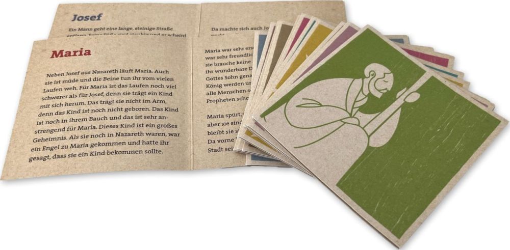 Die Karten können aufgestellt werden, sodass Stück für Stück eine Krippenszene entsteht, oder an einer Schnur aufgehängt werden.