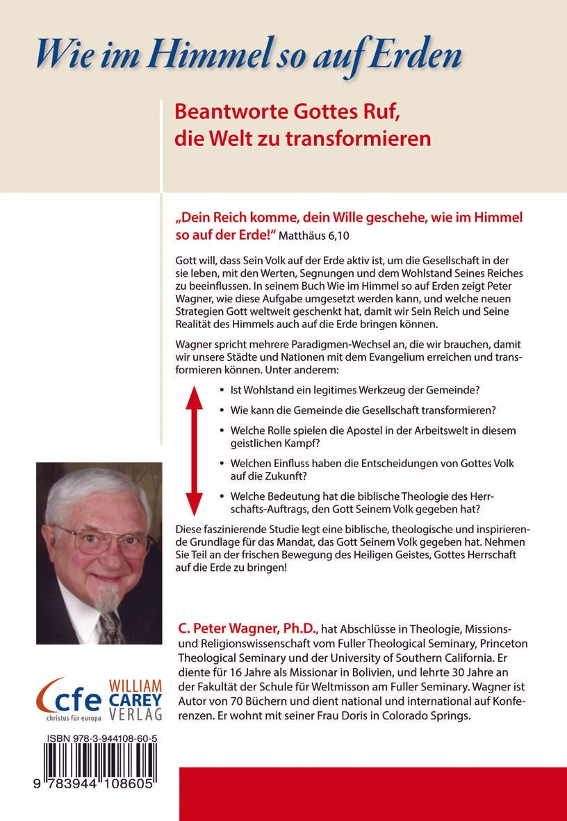 Gott hat einen Plan, alle Völker und Nationen zu Jesu Jüngern zu machen, und Er will Sein Volk dafür trainieren und gebrauchen, um Sein Reich in der Gesellschaft zu bauen. In diesem wichtigen Buch, zeigt Peter Wagner, der bekannte Missionsstratege, wie dies geschehen kann, und in welchen neun Bereichen wir als Volk Gottes unser Denken verändern müssen, um die Werte und die Realität des Himmels auf die Erde zu bringen, wo wir leben und arbeiten. Ein sehr spannendes und praktisches Lehrbuch über Transformation von Städten und Nationen!