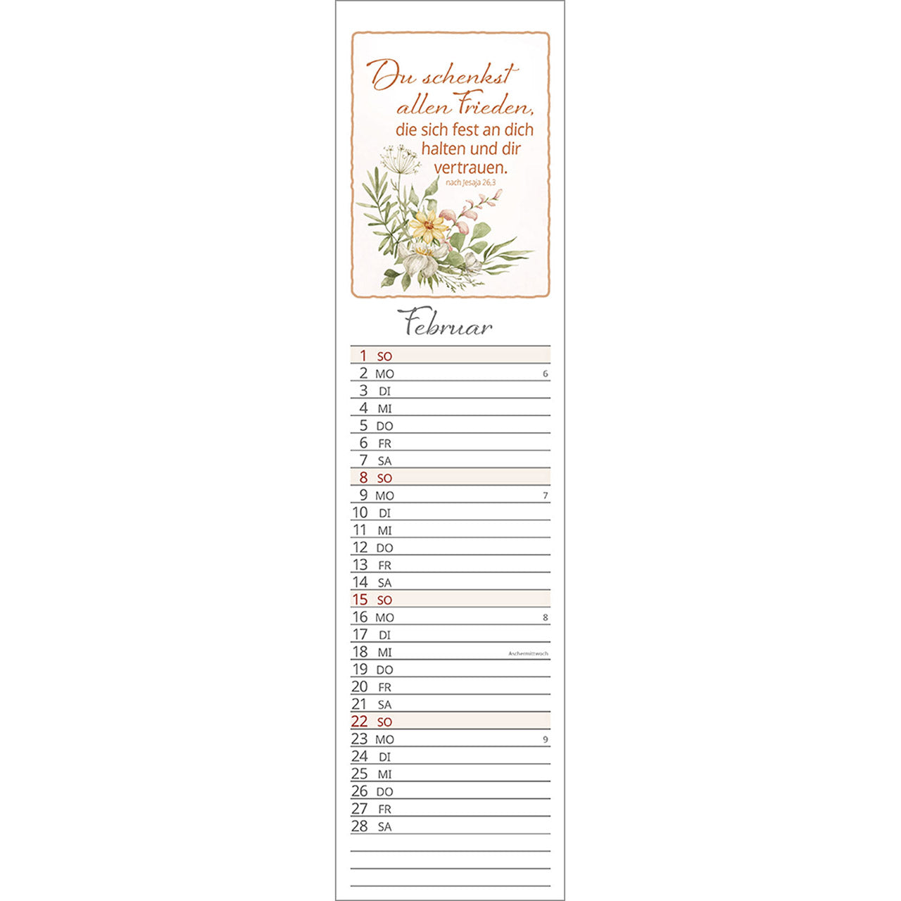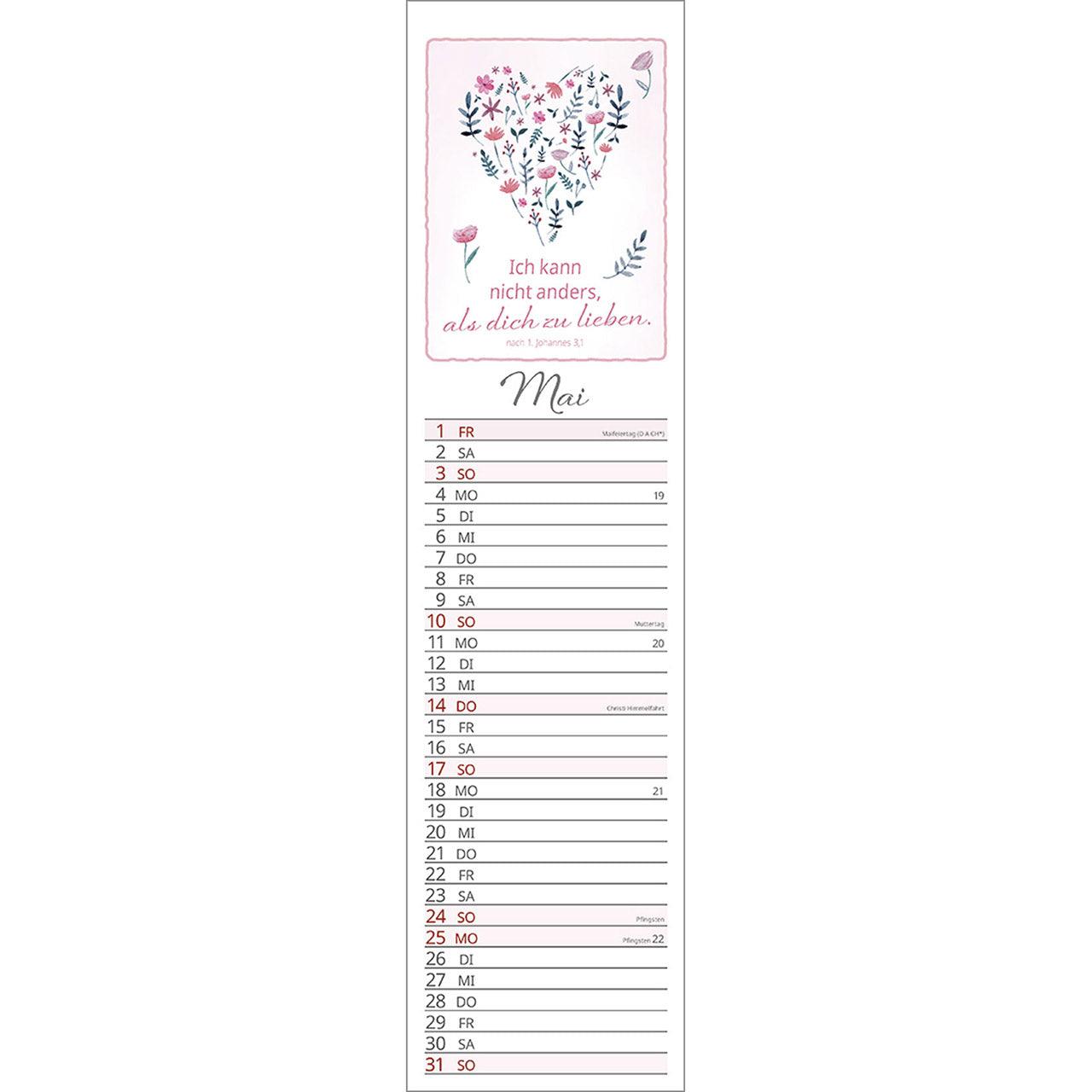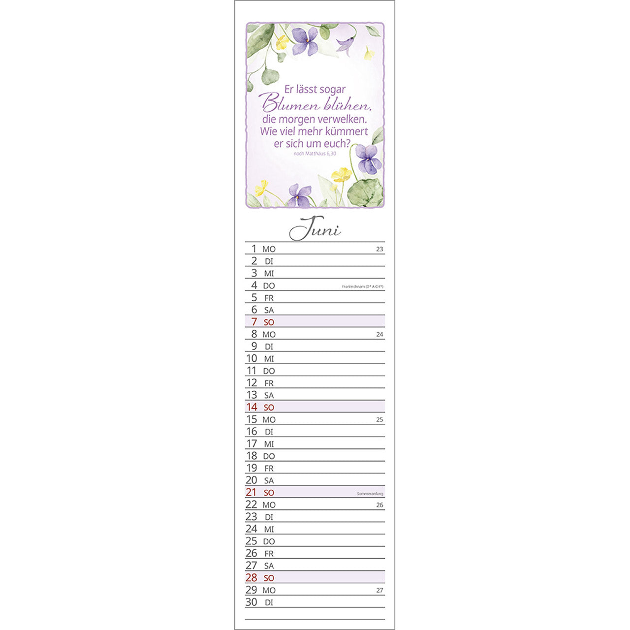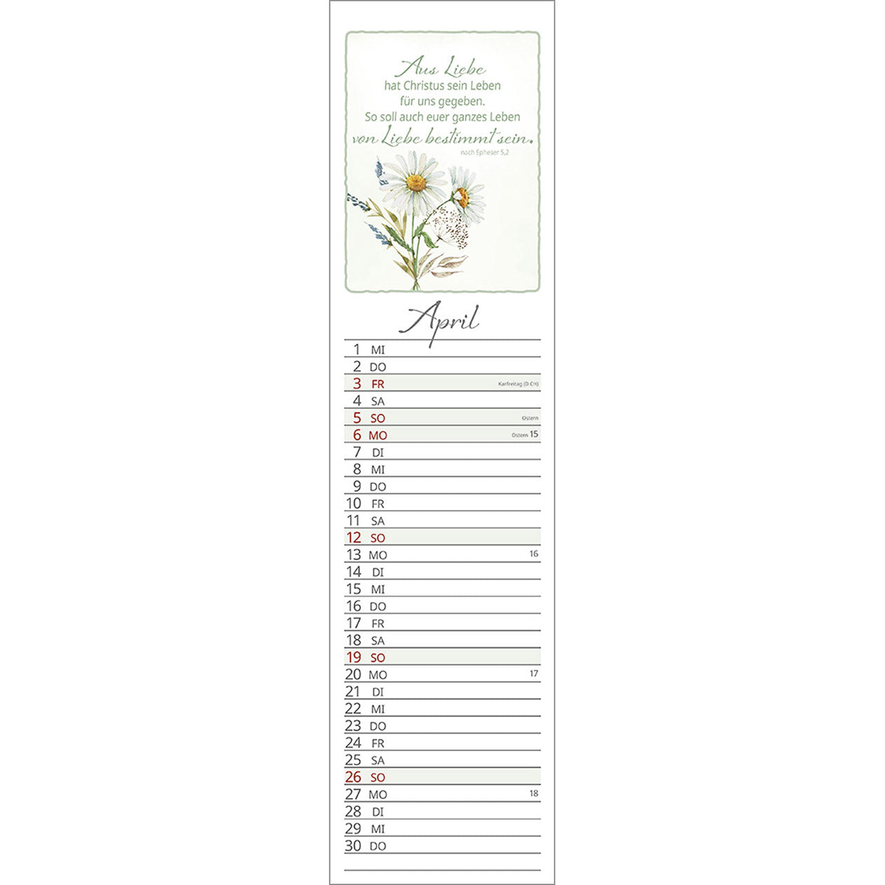Der farbenfrohe Streifen-Terminer überzeugt durch feine florale Aquarellmotive und berührende Bibelimpulse, die Ihnen jeden Monat aufs Neue Gottes Liebe und Zuwendung vor Augen führen.