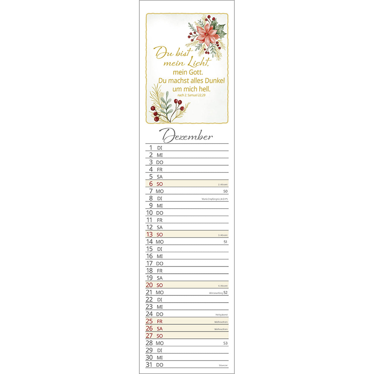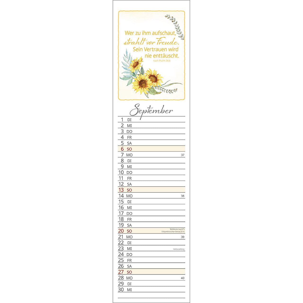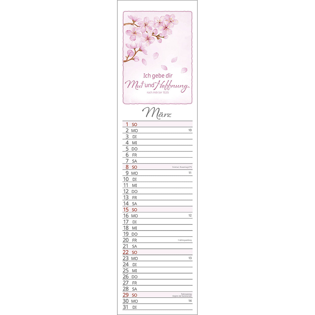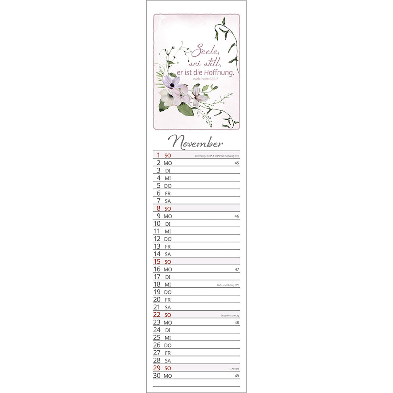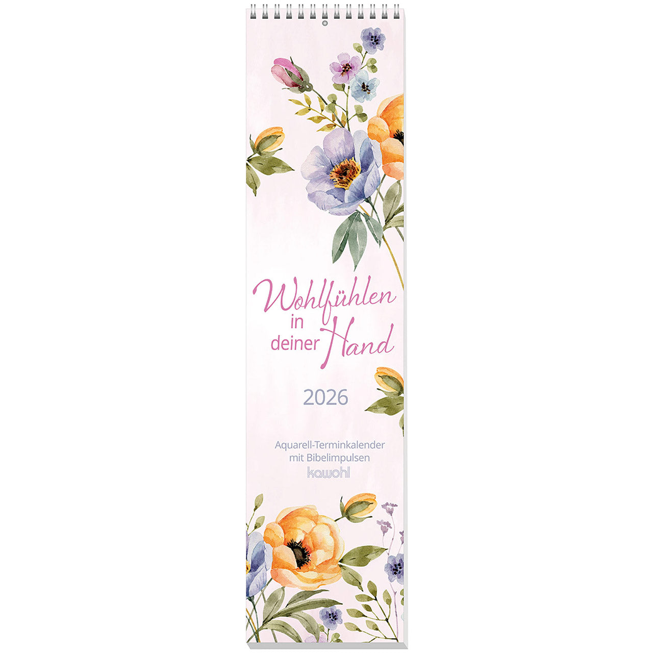 Der farbenfrohe Streifen-Terminer überzeugt durch feine florale Aquarellmotive und berührende Bibelimpulse, die Ihnen jeden Monat aufs Neue Gottes Liebe und Zuwendung vor Augen führen.