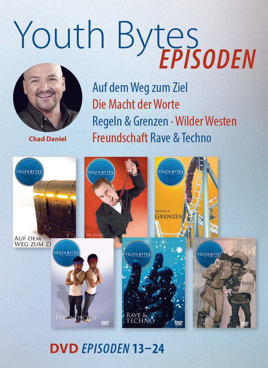 Die 24 Episoden von Youth Bytes sind eine lohnende Investition für jede Jugendgruppe und Arbeit mit Teenagern. In den professionell aufgenommenen Filmen spricht Chad Daniel auf kreative und sehr unterhaltsame Weise Themen an, die für das Leben von jung und alt wichtig sind - Sünde, Jesus, Gruppenzwang, Täuschung, Heuchelei, Freundschaft, und vieles mehr. Ideal für Gruppen!