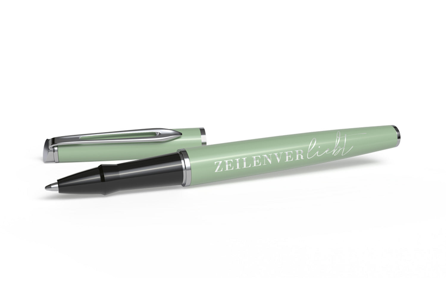 Mit diesem formschönen Tintenroller komplettieren wir das beliebte Papeterie-Programm von Rebekka Rochlitzer. Passend zu den beiden bereits erschienenen Notizblöcken, trägt der Tintenroller mit einem Metallgehäuse die silberne Gravur ZeilenverLiebt und ist in einem edlen Geschenkkarton verpackt.