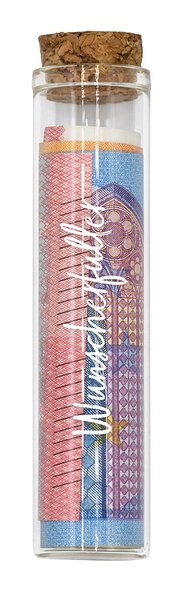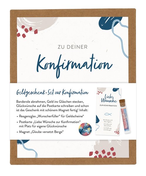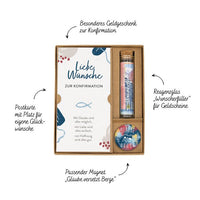 Dieses Geldgeschenk-Set bietet eine originelle und stilvolle Alternative. Das Reagenzglas mit dem Schriftzug "Wunscherfüller" gibt den Geldscheinen einen besonderen Platz in der dekorativen Geschenkbox. Persönliche Glückwünsche lassen sich auf der Postkarte "Liebe Wünsche zur Konfirmation" festhalten. Abgerundet wird das Set durch den ermutigenden Magneten "Glaube versetzt Berge".