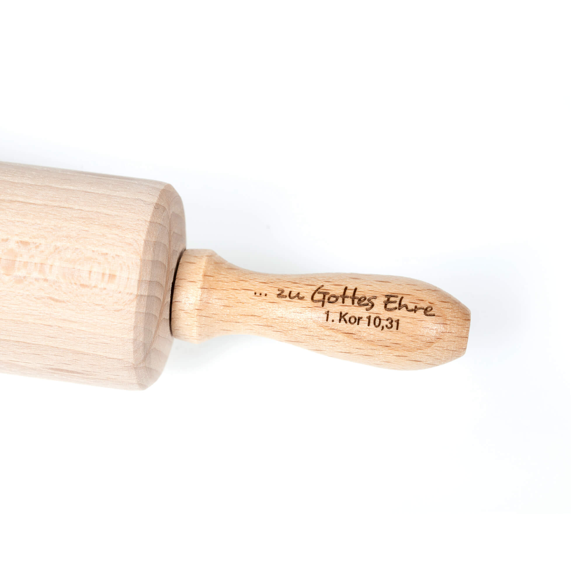 Nudelholz für kleine Küchenhelfer aus Buchenholz mit Lasergravur "... zu Gottes Ehre - 1. Kor 10,31" auf dem Griff.