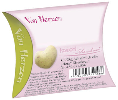 Original Schafmilchseife (30 g) in Herzform umhüllt von guten Gedanken. Geschenketui mit Grußmöglichkeit auf der Rückseite.
