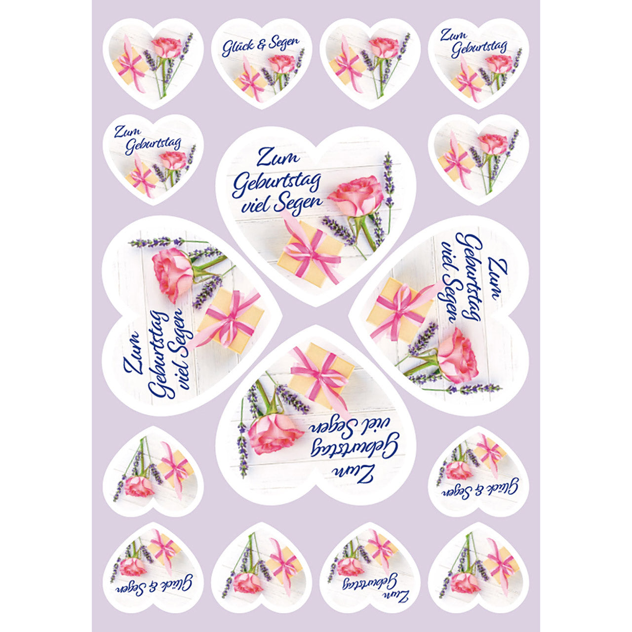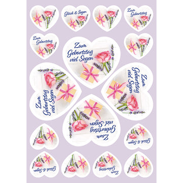 Text: (große Aufkleberherzen) Zum Geburtstag viel Segen
