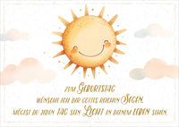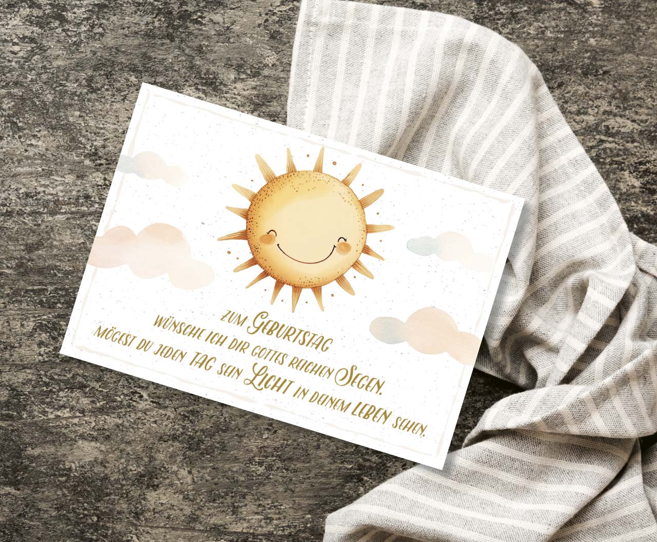 Zum Geburtstag wünsche ich dir Gottes reichen Segen. Mögest du jeden Tag sein Licht in deinem Leben sehen.